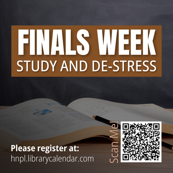 Don't let stress win this coming finals week. Join us at HNPL to study with friends, eat pizza, and pet therapy dogs to de-stress. Hamilton Heights' own Kinley will be here with other therapy dogs. We'll have study tables set up for quiet (not silent) group study. Leave with a stress ball and strategies to relax and de-stress before your big exam!